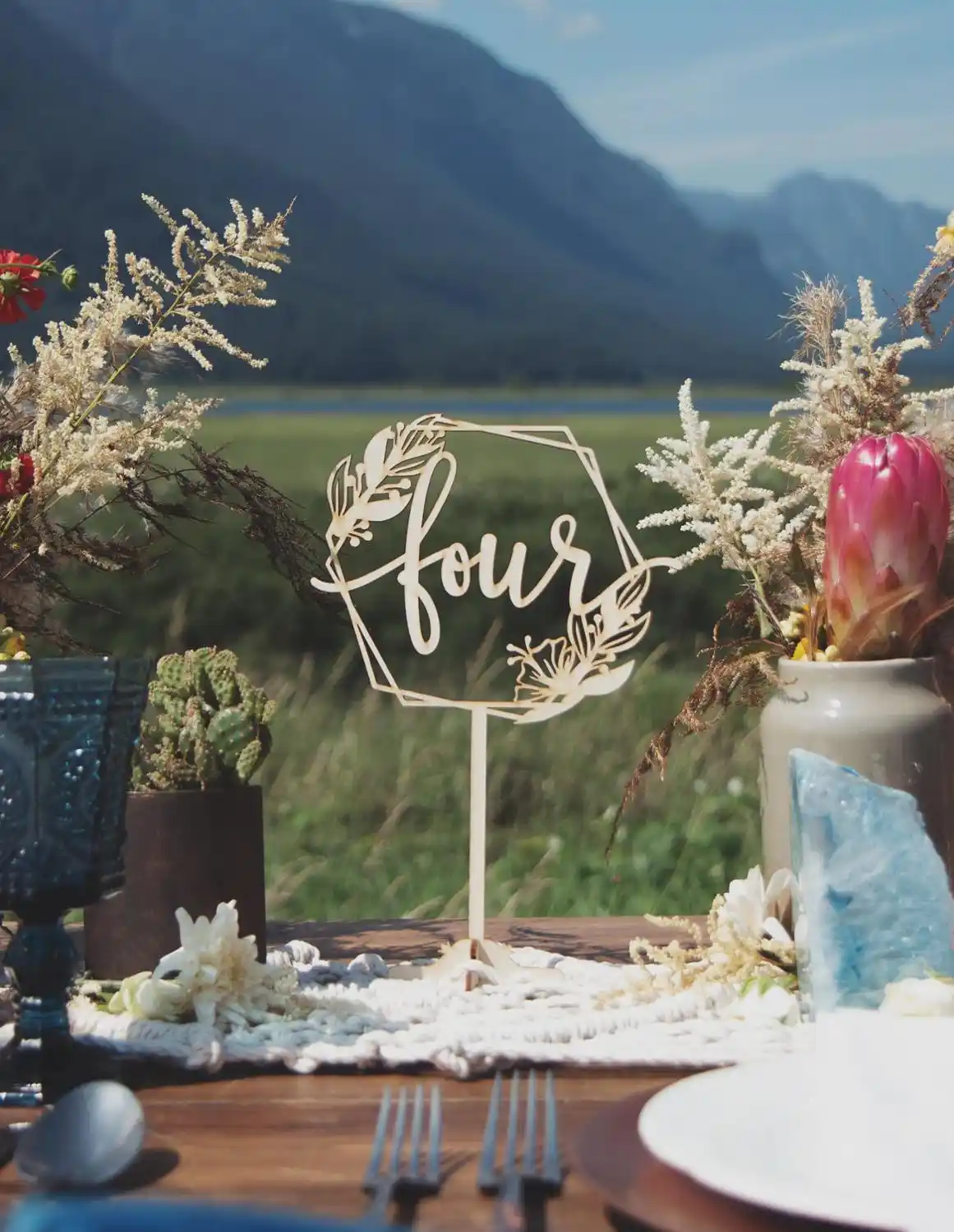 Rustic wedding table setting with wooden sliced logs, plant and pine cones.
